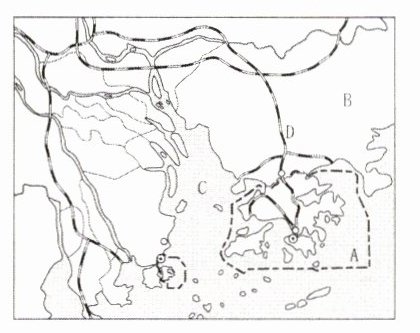(1)写出图中字母所代表的地理事物名称。特别行政区A是______________;省级行政区B的简称是________;入海口C是__________;铁路线D是_________。