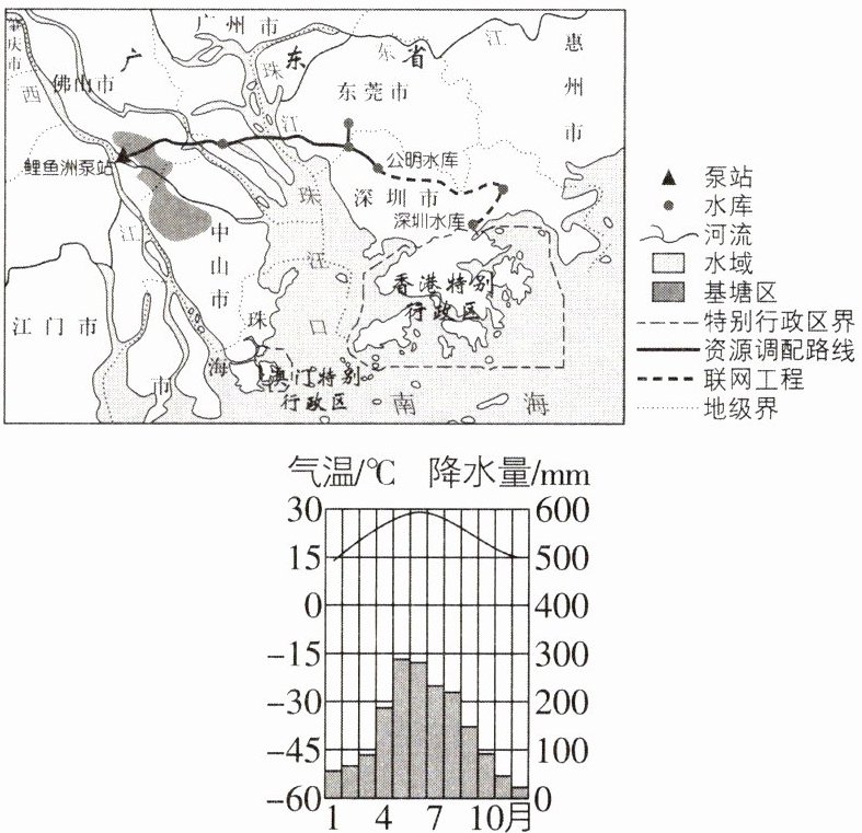 粤港澳大湾区是中国开放程度最高、经济活力最强的区域之一,在国家发展大局中具有重要战略地位。建设粤港澳大湾区,既是新时代推动形成全面开放新格局的新尝试,也是推动“一国两制”事业发展的新实践。粤港澳大湾区以不到全国0.6%的国土面积创造了全国1/9的经济总量,可谓名副其实的“中国第一湾”。下图是珠江三角洲示意图和该地气候资料图。