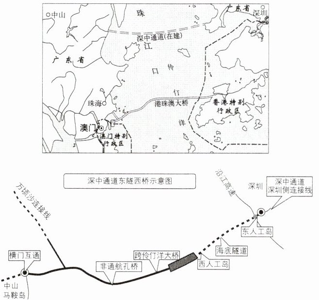 材料二 下图为深中通道和港珠澳大桥位置示意图和深中通道桥隧分布示意图。