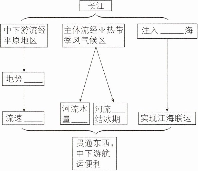 【解析】长江中下游流经平原地区,地势平坦,流速缓慢;长江主体流经亚热带季风气候区,河流水量大,无结冰期;长江注入东海实现江海联运;长江贯通东西,中下游航运便利。
