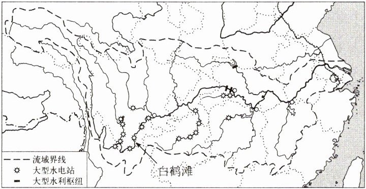 3[2024河南濮阳期末,中]白鹤滩水电站总装机容量1 600万千瓦,仅次于三峡水电站,成为中国第二大水电站。读长江流域水系和白鹤滩水电站位置图,完成下题。