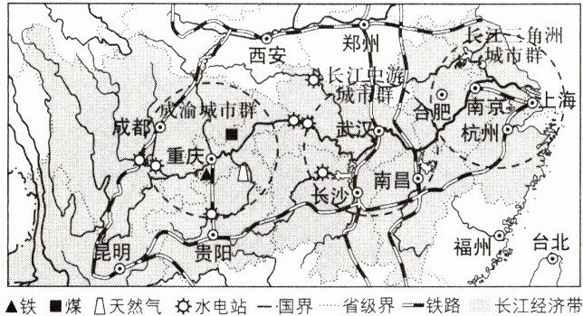 2. D 【解析】我国有四个直辖市,重庆是我国面积最大的直辖市,经济发展快速,是长江上游经济中心,A不符合题意;贵州省煤炭资源和水能资源都比较丰富,经济发展可发挥“水火互济”的优势,B不符合题意;长江经济带以上海为龙头,对区域经济发展具有辐射带动作用,C不符合题意;浙江省以轻工业为主,D符合题意。故选D。