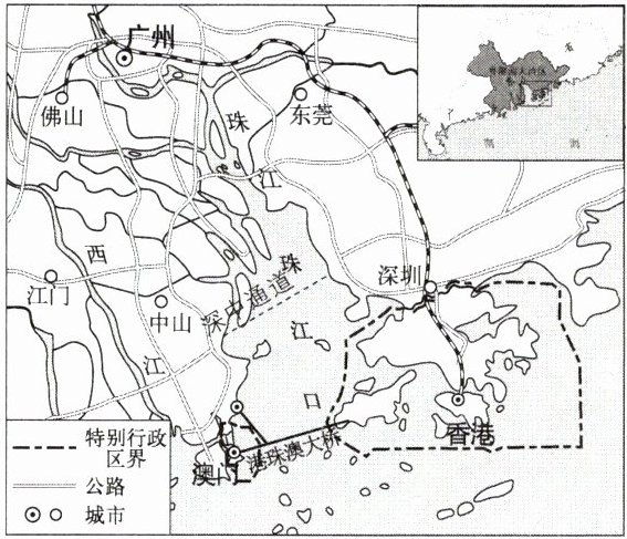 (2)港珠澳大桥缩短了______与珠海和澳门的通行时间。图中所示澳门经济的支柱是______业。