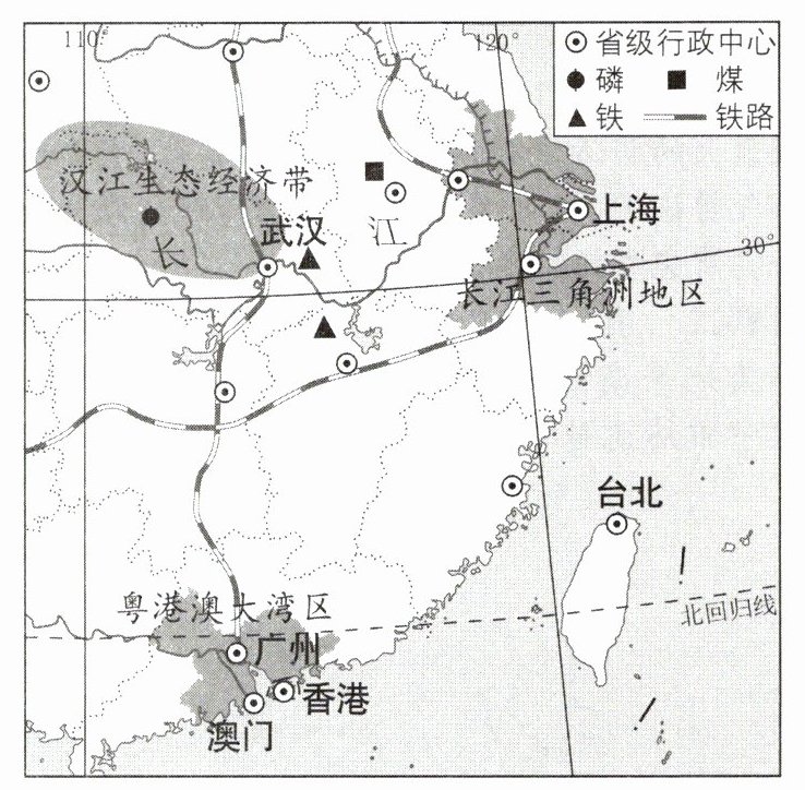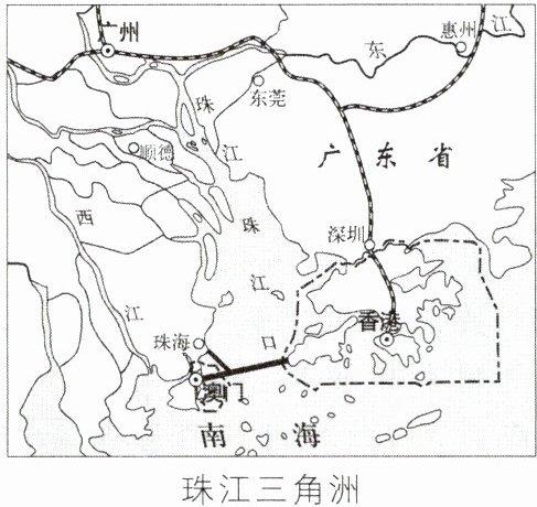 (1)珠江三角洲是改革开放的“南大门”,据图分析其发展经济的优势:毗邻______特别行政区,面向东南亚,海陆交通便利,且有国家优惠政策的支持,对外贸易发达。(1分)