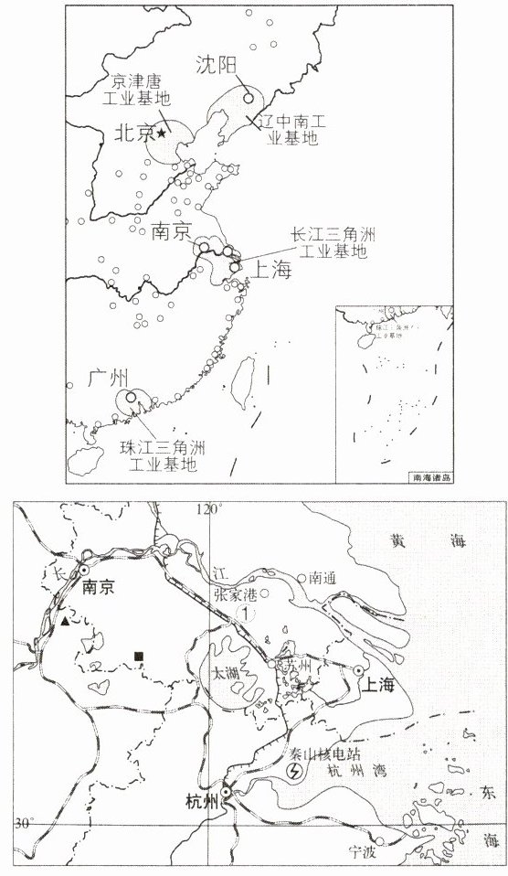 (2)读图分析,我国四大工业基地在分布位置上具有的共同特点是都分布在______地区。京津唐工业基地地理位置优越,但水资源缺乏限制了工农业生产的发展,为缓解此问题,你认为采取的可行性措施有哪些?(3分)