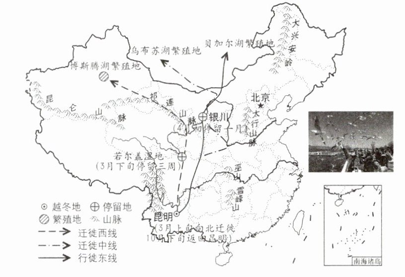 [难]云南十八怪——“海鸥也把闹市爱”,作为候鸟的红嘴鸥选择昆明(别称“春城”)周边越冬,与人同乐成为冬日奇观。读红嘴鸥在我国境内迁徙示意图,完成18~20题。