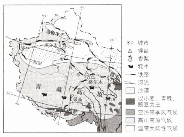 17. C 【解析】牦牛是青藏高原的特色畜种,库尔勒位于塔里木盆地,A 错误;格尔木有钾盐分布,那曲没有钾盐分布,B 错误;青稞是青藏高原的农作物,拉萨种植青稞,C 正确;库尔勒盛产香梨,D 错误。故选 C。