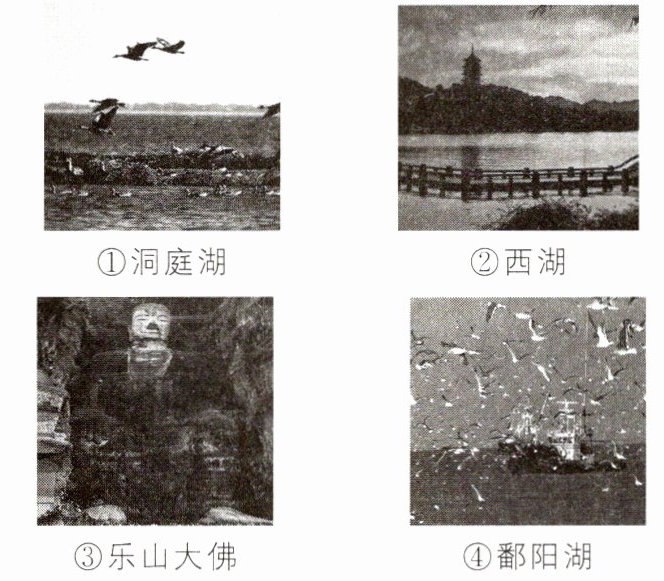 [2023湖北孝感模拟,中]下列图片是某地理考察队对东部沿海地区往中西部地区考察途中的宿营地的代表性景观(湖南洞庭湖、浙江杭州西湖、四川乐山大佛、江西鄱阳湖)图,完成12~14题。