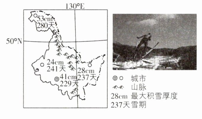(1)黑龙江省位于我国领土的最北端,纬度高,冬季寒冷而漫长,结冰期和雪期长,积雪厚,山地多,有利于高山滑雪等冰雪运动项目的发展。
