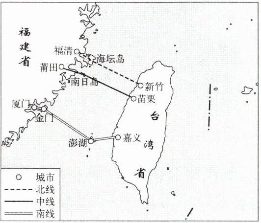 [2023贵州黔西南州期末]台湾海峡海底隧道工程线路有北线、中线、南线3个方案。读台湾海峡海底通道三方案示意图,回答5~6题。