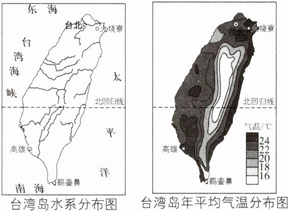 读台湾岛水系分布图和台湾岛年平均气温分布图,完成3~4题。