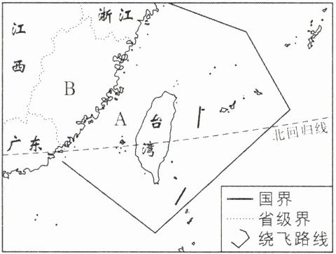 下图为某架飞机绕台湾省航行路线示意图,读图完成1~2题。