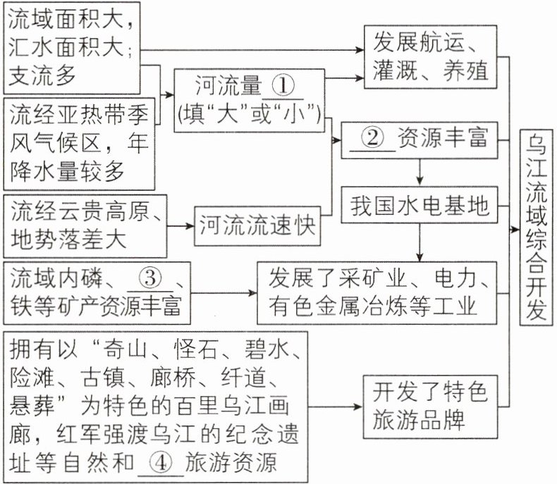 (2)小组同学依据查阅的资料绘制了乌江流域综合开发框图,在横线上填上适当的词语,帮助该小组完成框图。