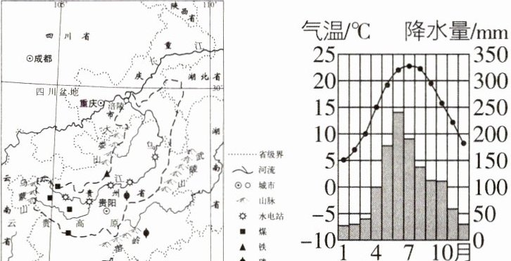 第一小组以“乌江流域概况”为主题进行研究,查阅有关乌江流域的资料。图为乌江流域示意图和贵阳气温曲线和降水量柱状图。