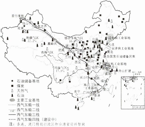 (2)近些年为拓宽能源进口渠道,我国加强了和多国的能源合作。西气东输二线和三线工程通过______边境口岸,从______(邻国)等国进口油气资源,输送到广州和福州;我国还加强与______(邻国)、俄罗斯等国的合作,进口油气资源输送到重庆和大庆。