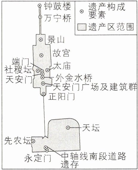 [2024四川成都中考]2024年1月,“北京中轴线”申遗文本提交至联合国教科文组织。如申遗成功,“北京中轴线”将成为北京第八项世界遗产。下图示意“北京中轴线”。据此完成1~2题。