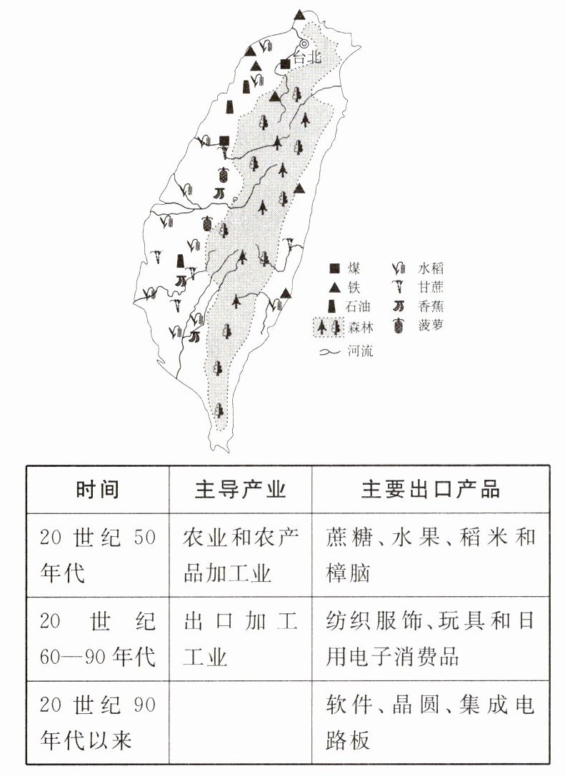 [2023陕西中考]台湾省自古以来一直是祖国不可分割的神圣领土,其丰富的水热资源为农业发展提供了有利的自然条件。随着经济发展,台湾省的产业结构也在不断变化。读台湾岛主要农矿产品分布图和台湾省20世纪50年代以来经济发展历程表,完成5~6题。