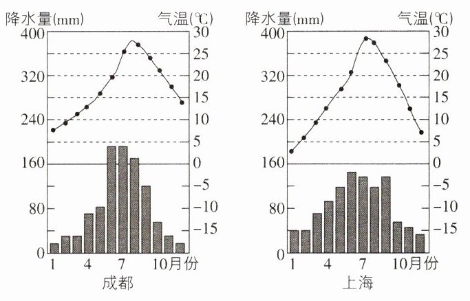 (2)成都 成都位于四川盆地,四周被高大的山脉包围,阻挡了来自北方的寒冷气流。而上海位于长江中下游平原,地形对寒冷气流阻挡作用小