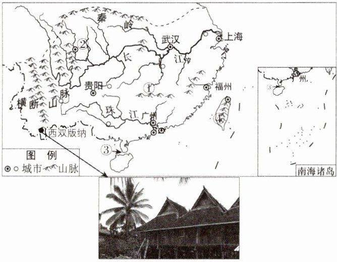 5核心素养区域认知[难]南方地区少数民族众多,民居独特。长江和珠江上游地区水能资源丰富,大、中型水电站众多。下图为我国南方地区示意图。请根据图文资料完成下列问题。