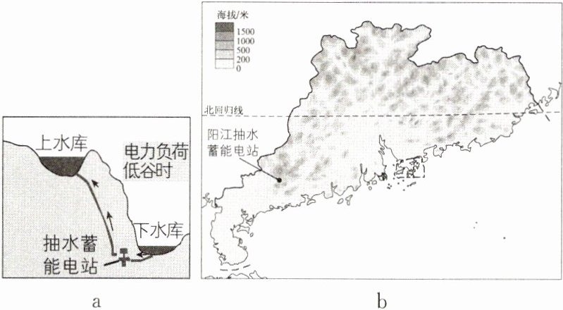 [2023广东中山期中,中]2022年阳江抽水蓄能电站投入使用,其主要利用上、下水库在电网用电低谷时抽水蓄电,用电高峰时放水发电,与水电、核电等机组协调运行。读图,完成3~4题。