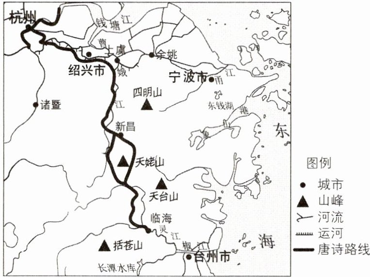 新考向传统文化[2024山东潍坊期末]“唐诗之路”是中国山水诗歌的摇篮,唐朝300多位诗人在此路上留下诗篇。下图示意浙东“唐诗之路”,读图完成1~2题。