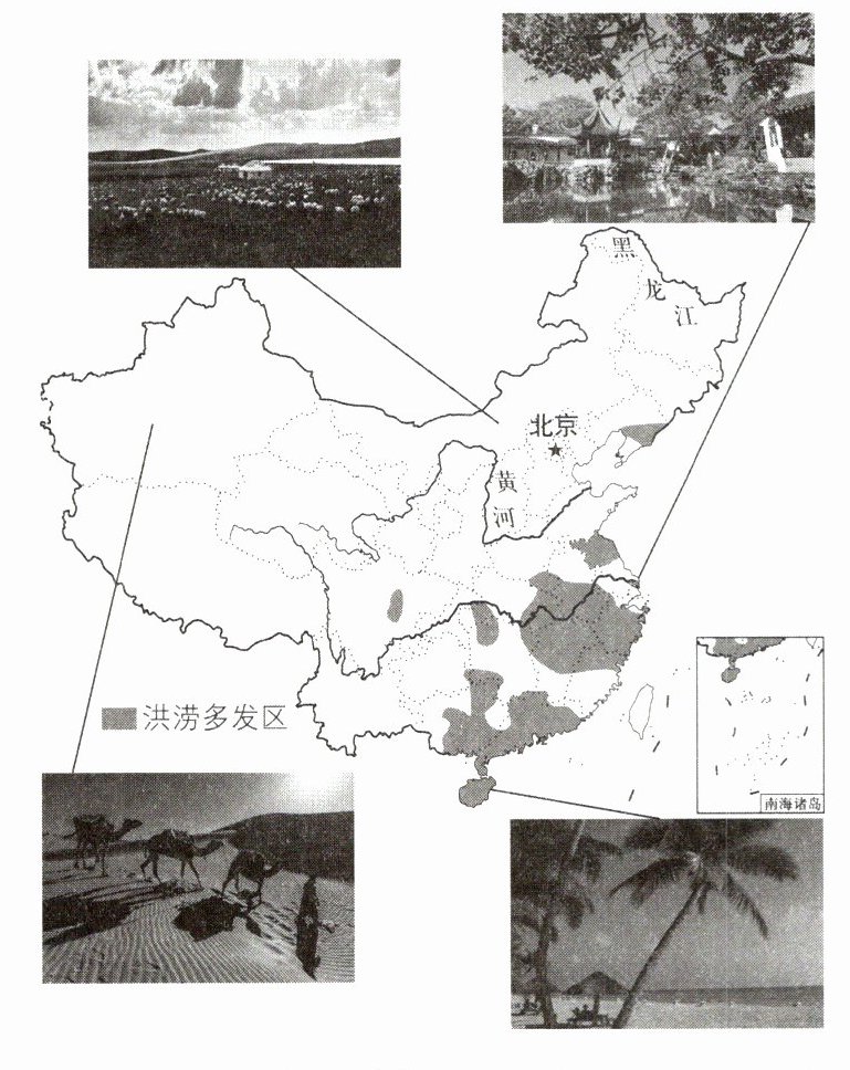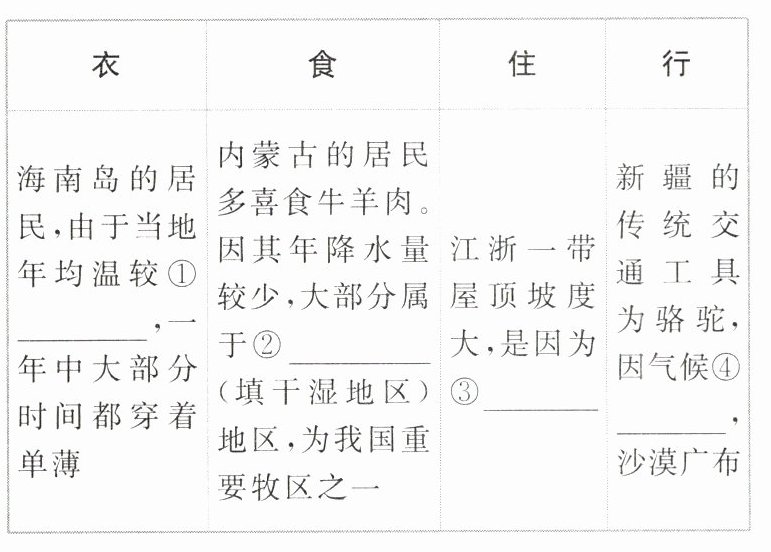 (1) 根据所学知识可知,海南岛纬度低,气温高,因此当地居民大部分时间穿着单薄;内蒙古地区以温带大陆性气候为主,年降水量在200~400毫米,大部分属于干旱、半干旱区,适宜牧草生长,是我国重要牧区之一;江浙地区位于亚热带季风气候区,降水丰富,屋顶坡度大利于雨水下泄;新疆深居内陆,远离海洋,降水稀少,气候干旱,沙漠广布。