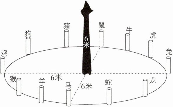 [2024云南中考]我国某城市广场修建了十二生肖柱,均匀排列成圆形,中间是6米高的雕像柱,生肖鼠位于正北方向(下图)。一年中大多数日子的正午时刻,雕像柱影子投向鼠柱。据此回答1~2题。