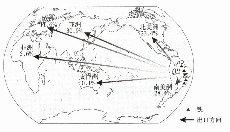 12. A【解析】读图可知,巴西的钢铁产品出口亚洲的比重占30.9%,比重最大,A正确。故选A。