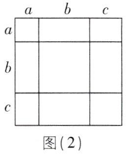 (2)中图形的面积既可以表示为$(a + b + c)^{2}$,又可以表示为$a^{2}+b^{2}+c^{2}+2ab + 2ac + 2bc$,所以$(a + b + c)^{2}=a^{2}+b^{2}+c^{2}+2ab + 2ac + 2bc$。