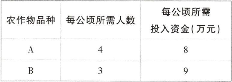 6[2024安徽中考]乡村振兴战略实施以来,很多外出人员返乡创业. 某村有部分返乡青年承包了一些田地,采用新技术种植A,B两种农作物. 种植这两种农作物每公顷所需人数和投入资金如下表: