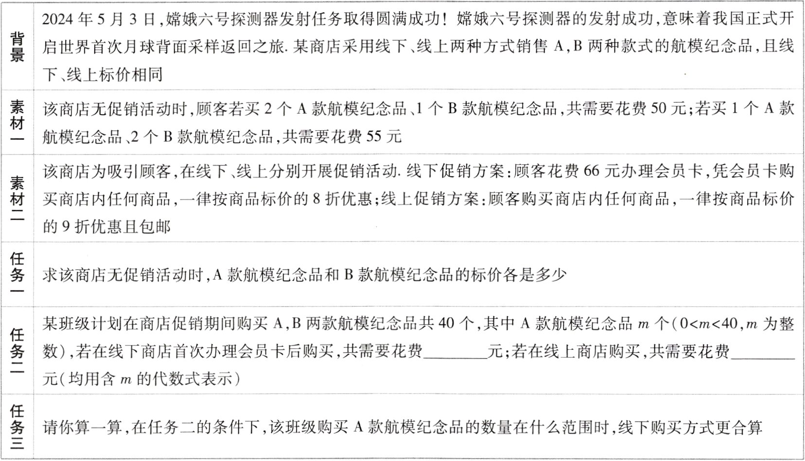 |背景|2024年5月3日,嫦娥六号探测器发射任务取得圆满成功!嫦娥六号探测器的发射成功,意味着我国正式开启世界首次月球背面采样返回之旅. 某商店采用线下、线上两种方式销售A,B两种款式的航模纪念品,且线下、线上标价相同|