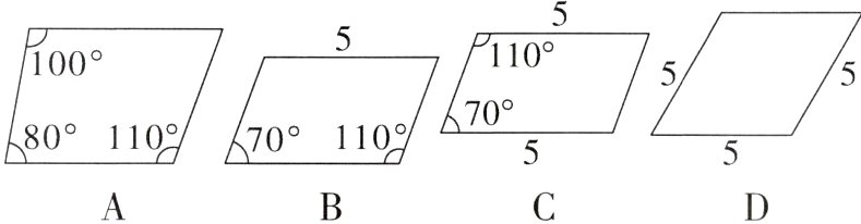 C【解析】A选项,由同旁内角互补,两直线平行判定四边形上下一组对边平行,左右一组对边不平行,故四边形不是平行四边形,故A不符合题意;B选项,由同旁内角互补,两直线平行判定四边形左右一组对边平行,不能判定左右一组对边相等或上下一组对边平行,故不能判定四边形是平行四边形,故B不符合题意;C选项,由同旁内角互补,两直线平行判定四边形上下一组对边平行,结合上下一组对边相等,可以判定四边形是平行四边形,故C符合题意;D选项,四边形的左右一组对边相等,但不能判定上下一组对边相等或左右一组对边平行,故不能判定四边形是平行四边形,故D不符合题意. 故选C.