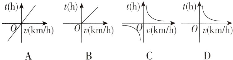 D【解析】设甲、乙两地之间的距离为$s\mathrm{km}$,则$vt = s$(定值),$\therefore t = \frac{s}{v}(v > 0,t > 0)$,符合反比例函数的一般形式,且速度和时间均为正数,图像应为在第一象限的双曲线.
