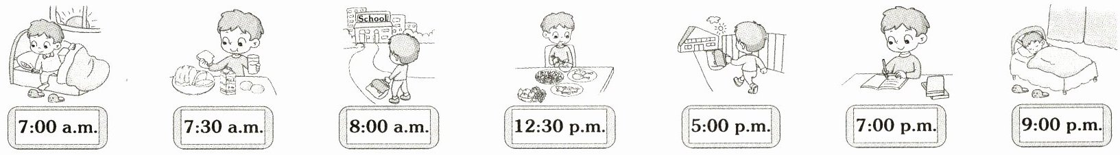例文: Paul gets up at 7:00 a.m. He usually eats breakfast at 7:30 a.m. He goes to school at 8:00 a.m. He usually eats lunch at 12:30 p.m. He goes home at 5:00 p.m. He does his homework at 7:00 p.m. He goes to bed at 9:00 p.m. This is Paul's day.