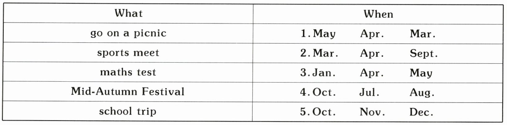 三、听长对话,圈出下列活动或节日对应的时间。(10 分)