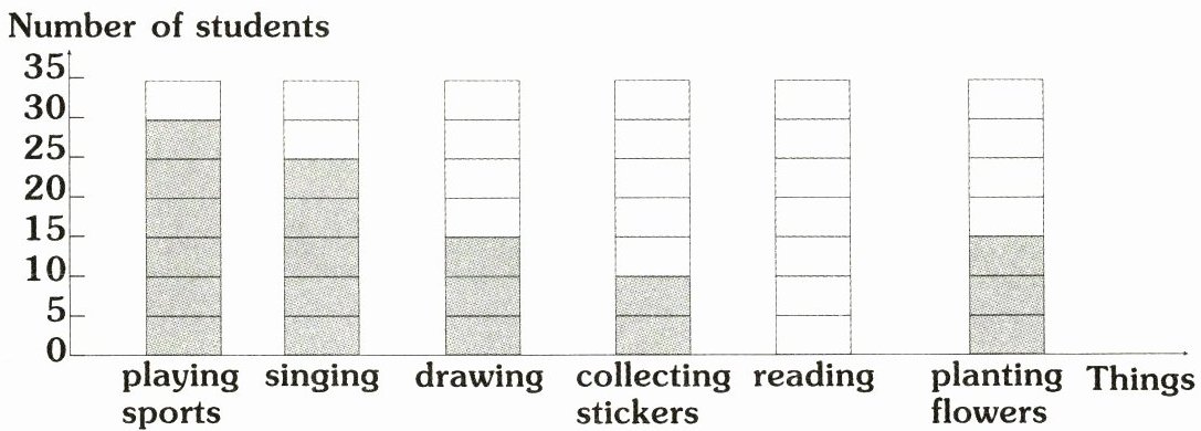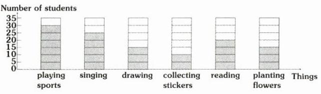 There are 35 students in Class One,Grade Five. They like doing different things(事情) in their free time. Here is the result.