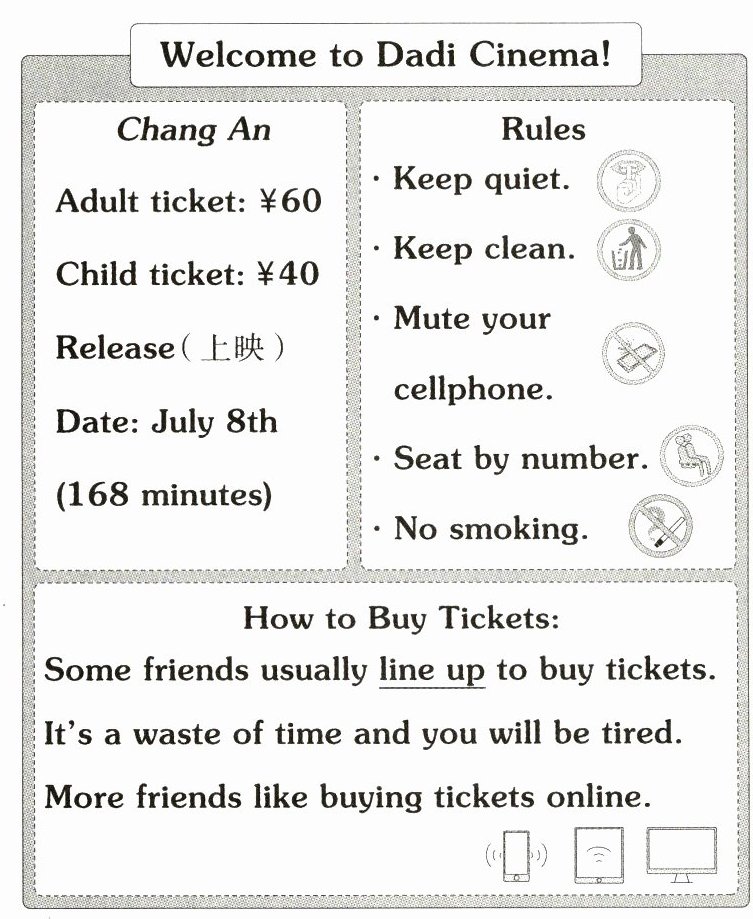 ( )4. Lily is a student in Grade 5. She wants to see the film with her parents. They should pay ________ yuan.