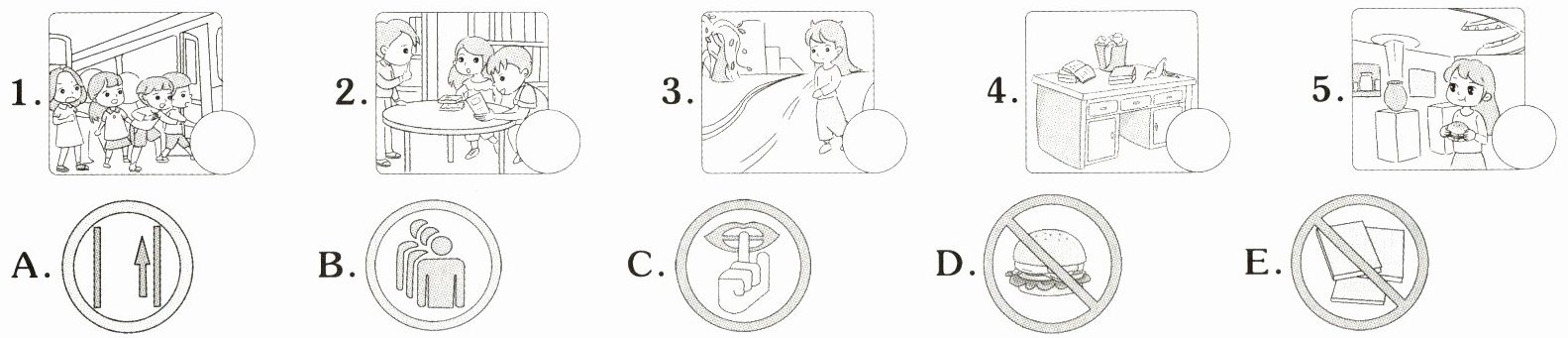生活处处有规则。根据图片提示,选择对应的警示标识,并写出对应的规则。