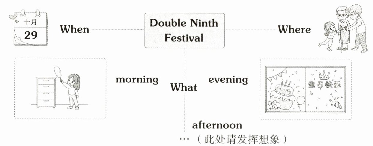 二、重阳节是中国的传统节日。假如你是Lily,请根据思维导图提示,写一写你在重阳节这天将要做的事情吧!