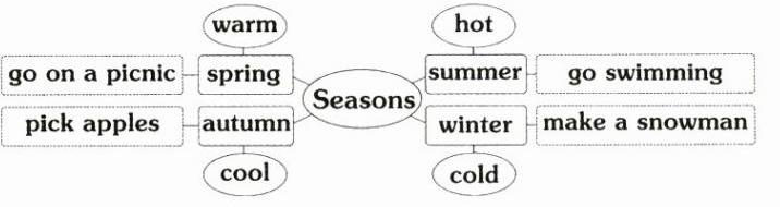 There are four seasons in a year. They are spring, summer, autumn and winter. Spring is warm. We can see many flowers and green trees. We can go on a picnic in spring. In summer, it's hot. We can go swimming. It's cool in autumn. We can pick apples. In winter, it's cold. It snows sometimes. When it snows, we can make a snowman with friends.