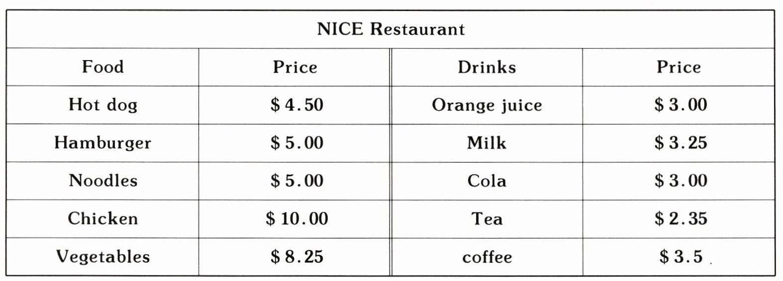示例: A hamburger; some vegetables; a cola; sixteen dollars and twenty-five cents