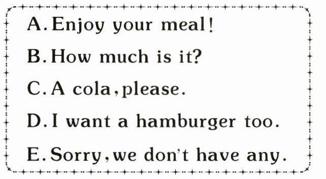 Simon;OK.Here you are.Cashier: Thank you.Here's your food and drinks.5.