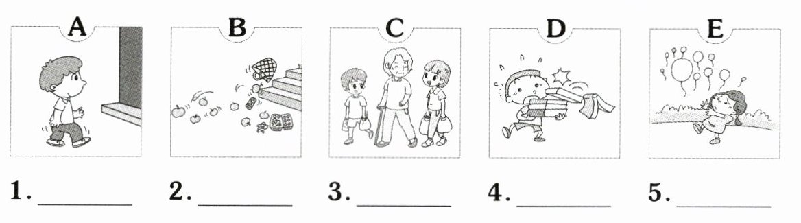 Amy is going home from the supermarket. She has 1. ________ two heavy shopping bags. Inside the bags, there are lots of 2. ________. She is walking slowly. But 3. ________ down and all the eggs are broken. Some of the apples are falling. One of the 4. ________ is falling, too. What a 5. ________! Who can help her?