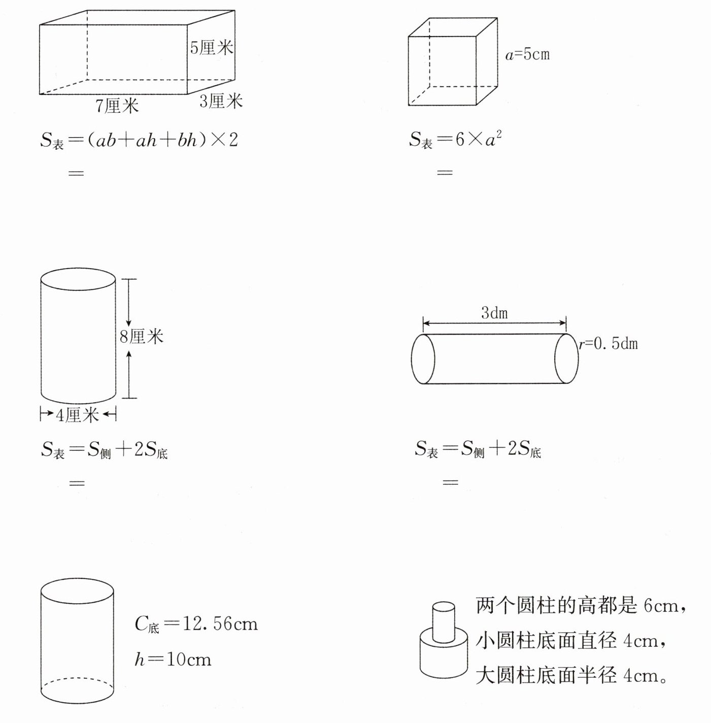 两个圆柱的高都是6cm,小圆柱底面直径4cm,大圆柱底面半径4cm。