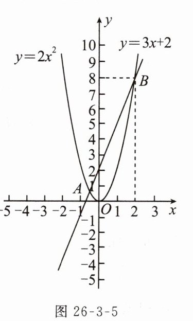 变式 如图26 - 3 - 5,在平面直角坐标系中,抛物线$y = 2x^{2}$与直线$y = 3x + 2$相交于点$A(-\frac{1}{2},\frac{1}{2}),B(2,8)$,则方程$2x^{2}-3x - 2 = 0$的解为________.