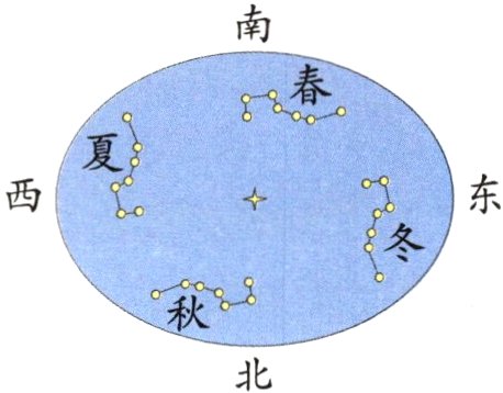我国古人便对天象很有研究,有古书记载:“斗柄东指,天下皆春;斗柄南指,天下皆夏;斗柄西指,天下皆秋;斗柄北指,天下皆冬。”也就是说,若把观测的时间固定于傍晚,则二月春分时斗柄指东,五月夏至时斗柄指南,八月秋分时斗柄指西,十一月冬至时斗柄指北。所以我们可以根据傍晚时斗柄所指的方向来判断季节。