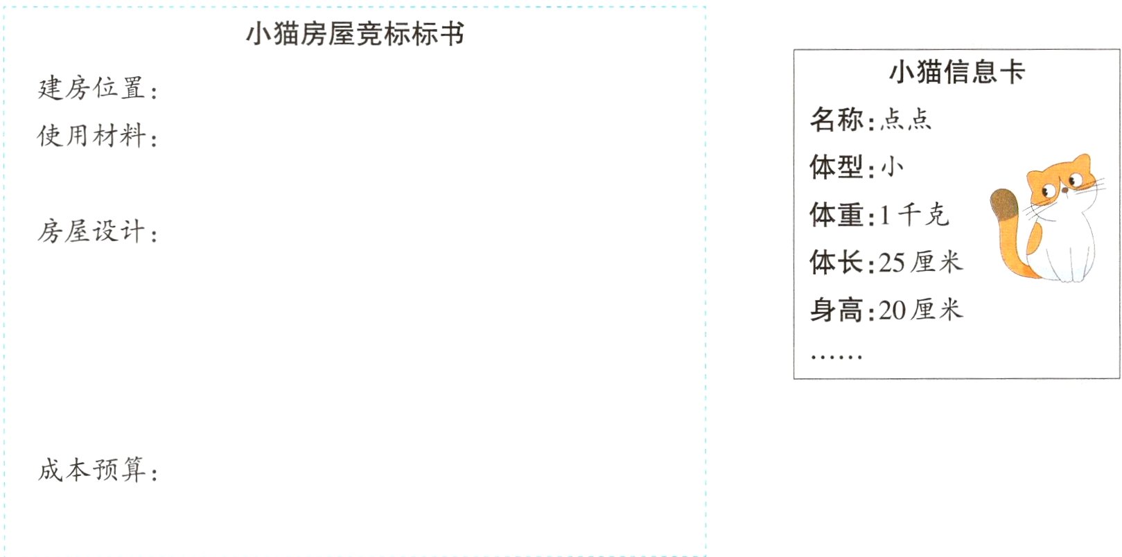 [新趋势·开放探究]萌小牛家收养了一只小猫,他和小组成员想给小猫做一个小房子。根据小猫的信息卡,我们来制订标书,参加投标。