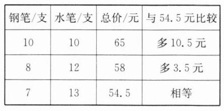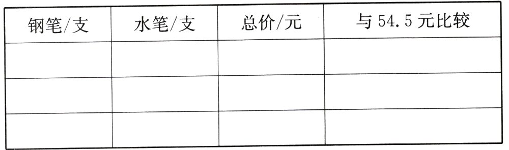 1(基础题)李老师花54.5元买了钢笔和水笔共20支,若每支钢笔5元,每支水笔1.5元,则李老师买了多少支钢笔?(列表解答)