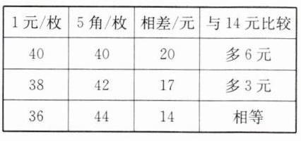 1元硬币有36枚,5角硬币有44枚。提示:注意审题,14元是总钱数的差。对于这类稍复杂的问题,可以通过列表进行调整,求出1元与5角的枚数。