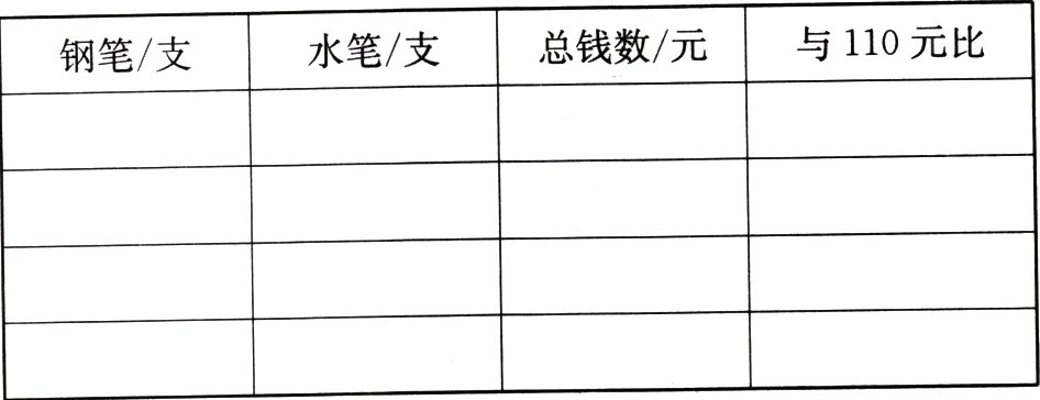 1. 钢笔每支20元,水笔每支2元,两种笔共买了20支,用了110元。钢笔和水笔各买了几支?(先列表解答,再检验)(10分)